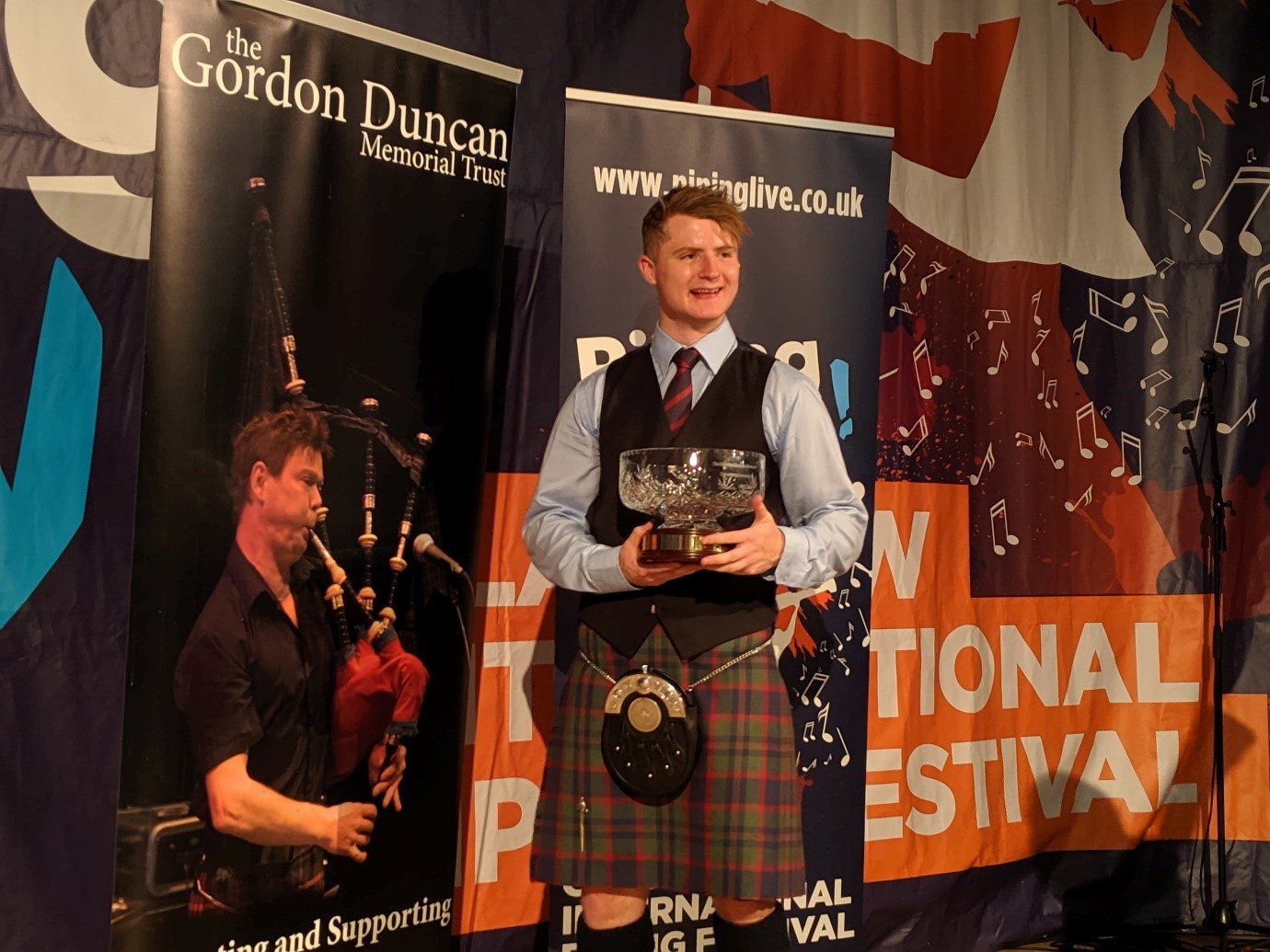 Bradley Parker from Portavogie, Co. Down, Northern Ireland won the 2019 Gordon Duncan Memorial Solo Piping Competition Trophy at The National Piping Centre on Sunday 18 August 2019.